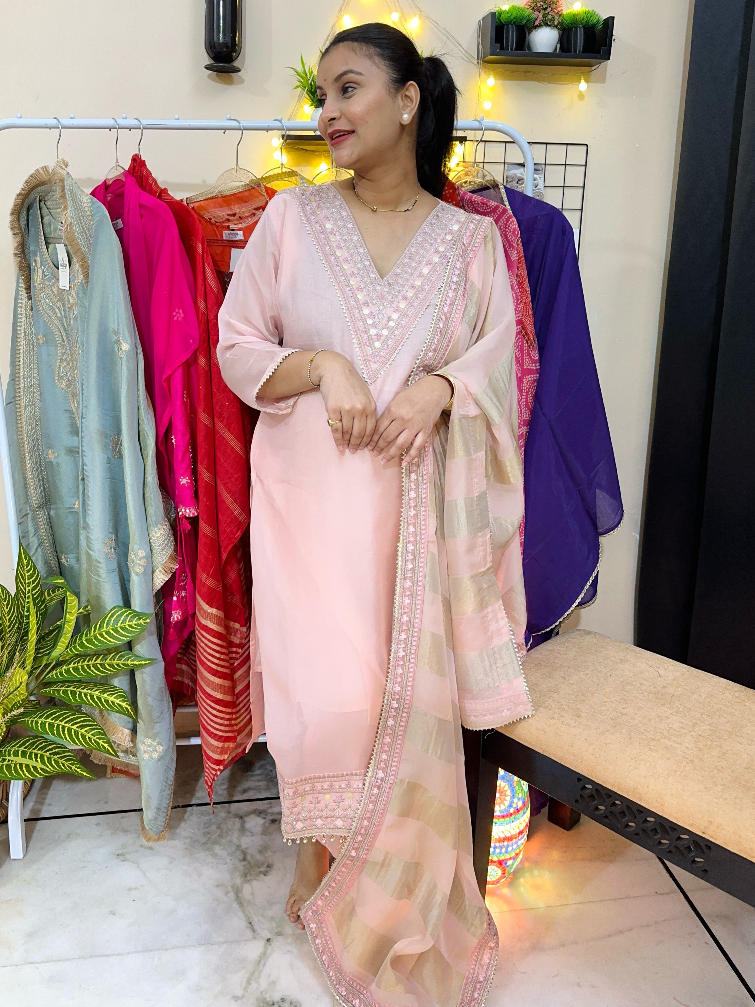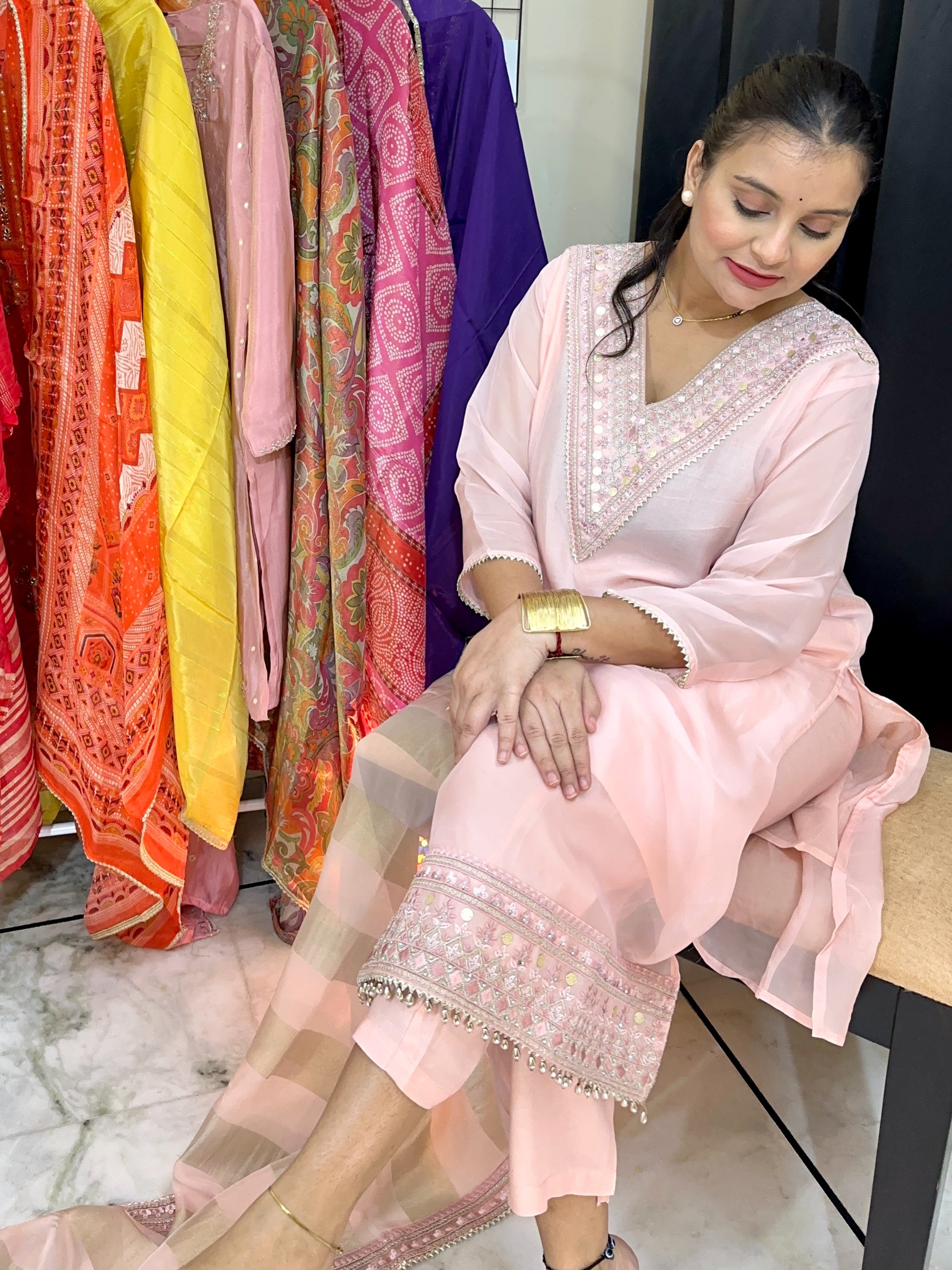 The set features intricate handwork and refined finishing, bringing out a harmonious balance of tradition and modern style. Its soft drape ensures comfort without compromising on elegance, making it a timeless addition to your wardrobe. Pair it with your favorite jewelry for a complete, graceful look that turns every moment into a statement.